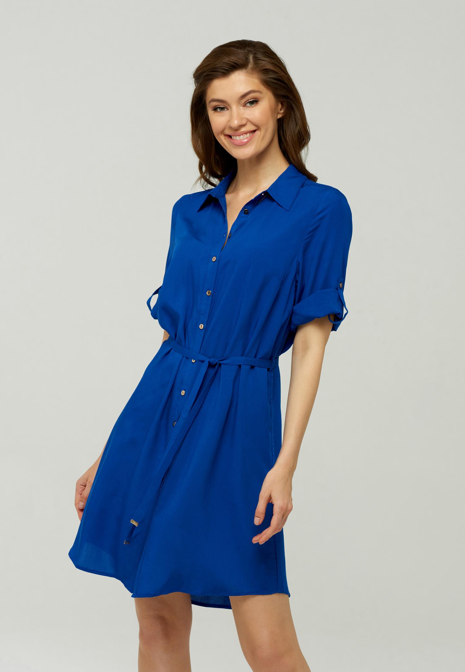 Платье-рубашка на пуговицах из дышащей, мягкой вискозной ткани. Закругленный подол с разрезами по бокам. Отложной воротник. Длинные рукава с манжетами на пуговицах. Длина рукава регулируется патой с застежкой. Съемный пояс с золотыми пряжками