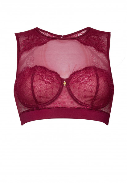 Короткий топ на каркасной поддержке с мягкой чашкой. Внутренняя поверхность чашки дублирована эластичной сеткой, что обеспечивает идеальную посадку. Спинка открыта и декорирована кружевом. Сзади застежка на крючках. Декор - подвеска.